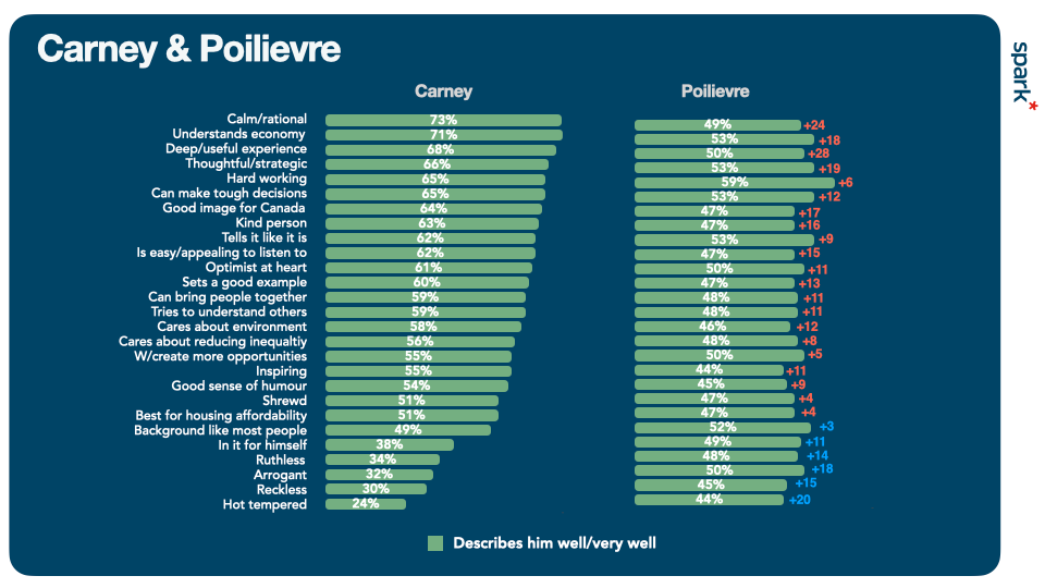 Carney has at 12 to 28 point advantage over his Conservative rival when it comes to these traits. He also has a 16 point advantage on being “a kind person”, an 11 point advantage for being an “optimist at heart” “tries to understand others” “inspiring” and “can bring people together”. These are traits that attract votes, not push them away.