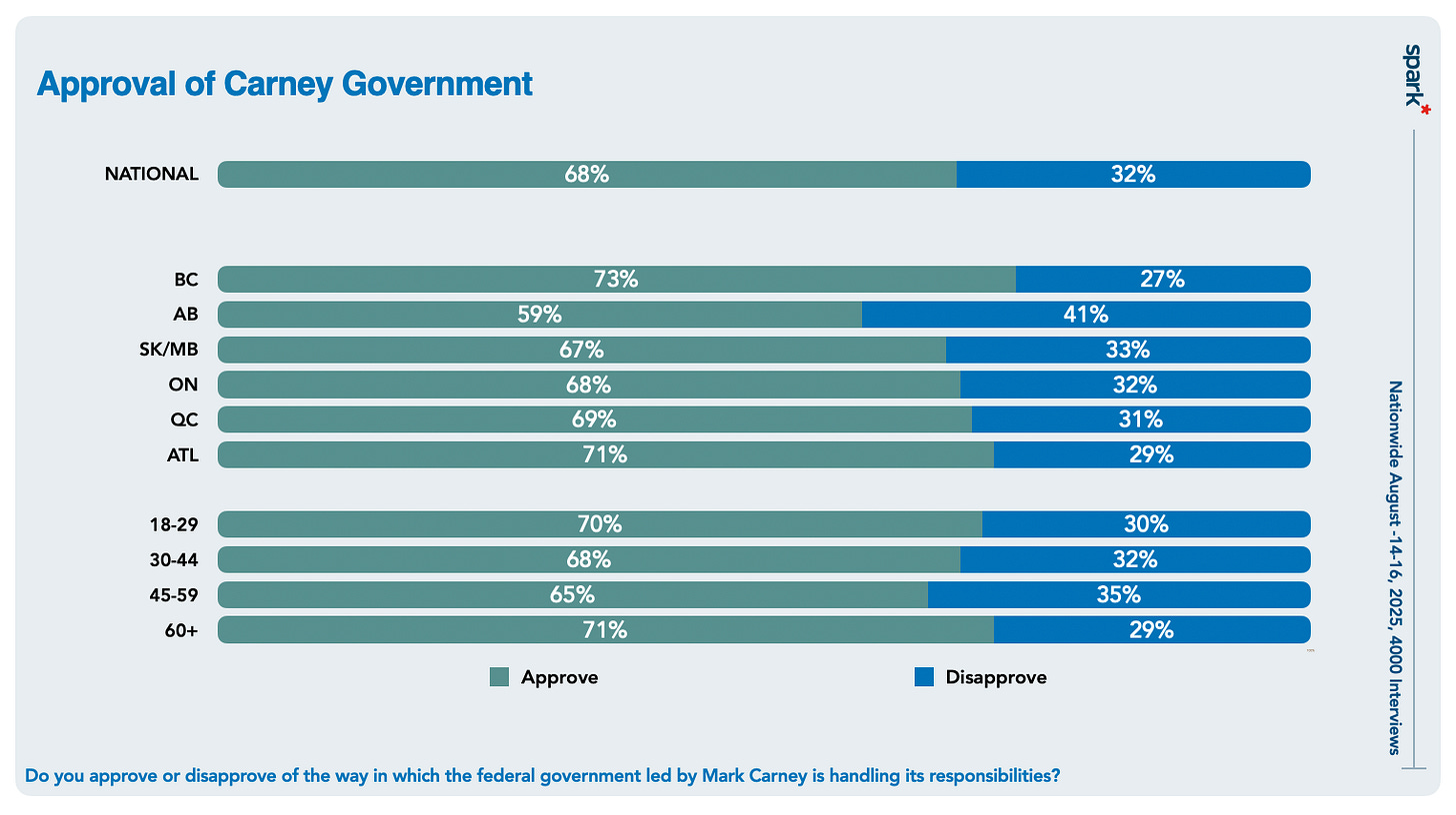 Right now, two out of three people approve of the way the federal government of Mark Carney is handling its responsibilities. It sits at about the same level whether you are 25 or 65. It’s two thirds or more everywhere but in Alberta - but in Alberta federal approval sits at a remarkable 59% today.
