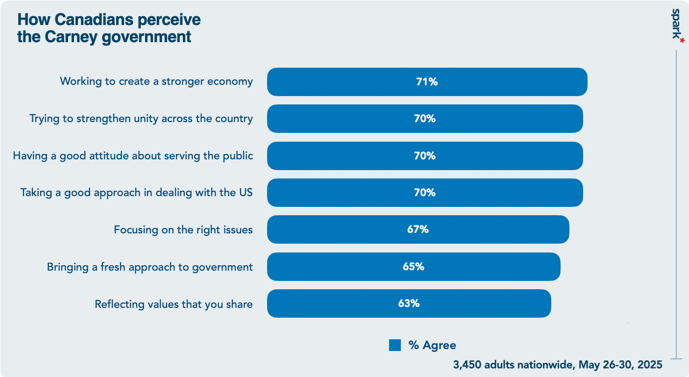 Two thirds or more of those surveyed feel the Carney government is bringing a fresh approach to government, focusing on the right issues, taking a good approach to dealing the the US, having a good attitude about serving the public, trying to strengthen unity, and working to create a stronger economy. (For those who maintained that the first couple of days of the new government were some sort of fumble-fest, the public has not seen it that way)