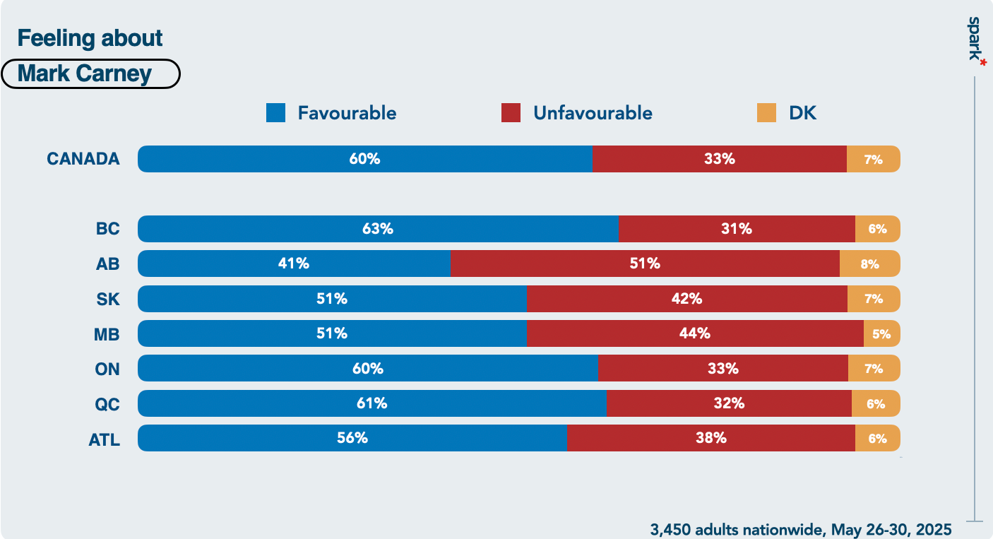 Asked for feelings about Mark Carney we find a 60% favourable, 33% unfavorable split. His net score is positive in every part of the country except Alberta - but in Alberta he finds 41% favourable, 51% unfavourable, definitely not what Liberal leaders have been used to seeing. Carney’s Alberta roots and approach to major projects and the energy conversation both are undoubtedly part of what is reflected in these numbers.