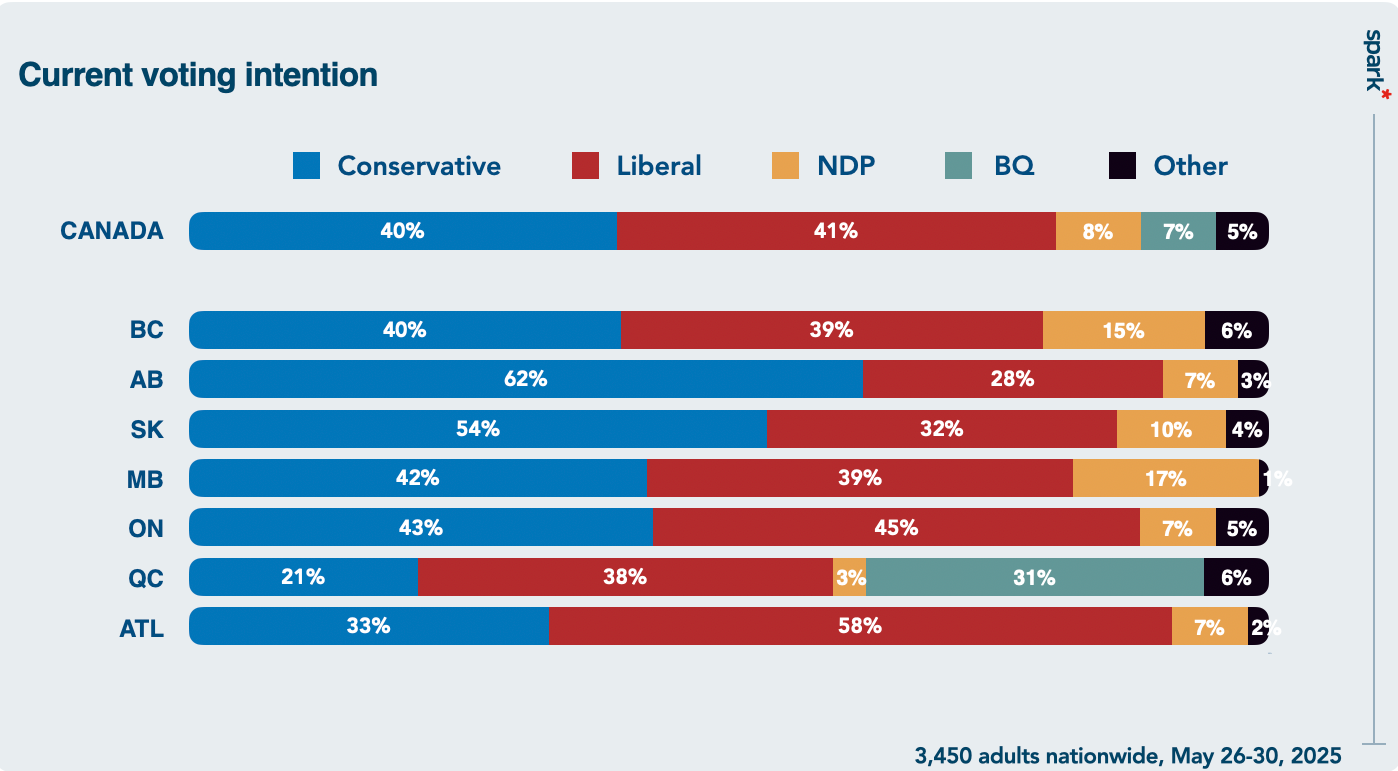 But new survey results conducted by Spark Insights (sample 3450, collected between May 26-30, 2025) tell a different story. While horse race numbers suggest an tight and polarized competition, these can mislead.