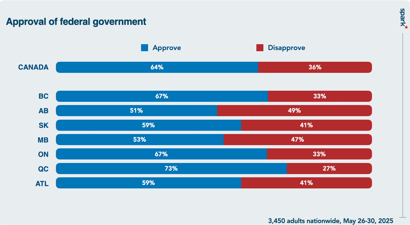 Almost 2 out of 3 (64%) approve of the way the federal government is handling its responsibilities. Among those who self define as on the “left of the spectrum” 80% approve, it’s 71% among those on the centre, but maybe the bigger news is that 38% of those who say they are on the right of the spectrum also approve of what they are seeing. So do 51% of Albertans, who clearly are seeing something in the Carney government that they haven’t seen from Liberals in a long time.